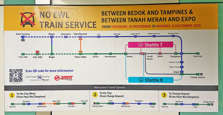 工事に伴いMRTのEast West Line(緑)の一部区間が臨時運休します。チャンギ空港を利用する方はTanah Merah駅で乗り換え出来ないためご注意ください。