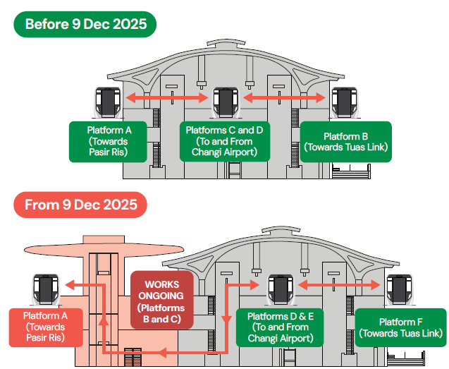 12月9日(火)からTanah Merah駅の東方面行き(Pasir Ris行き)のホームが以下に変更されます。都心方面からTanah Merah駅で空港方面へ乗り換えの際は駅1階を経由して空港方面のホームへ向かう必要があります。