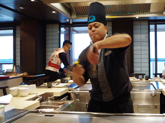 あっと驚く鉄板焼きシェフのパフォーマンスは、各カウンターで驚く声や笑い声が起こり、満席状態で人気でした。