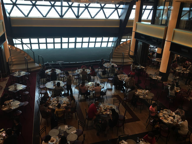 船尾に位置するドリームダイニング、2階分ある大きな窓からは雄大な海の景色を眺めることができます。