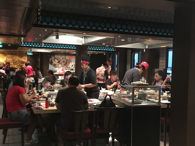 夕食はお寿司と鉄板焼きの和食レストラン「ウミウマ」(8階)、食事代がクルーズ代金に含まれていない有料のレストランです。